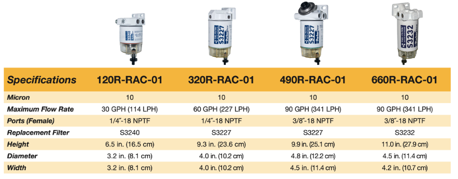 Eldsneytis- og vatnssía 120R-RAC-01 f. bensín