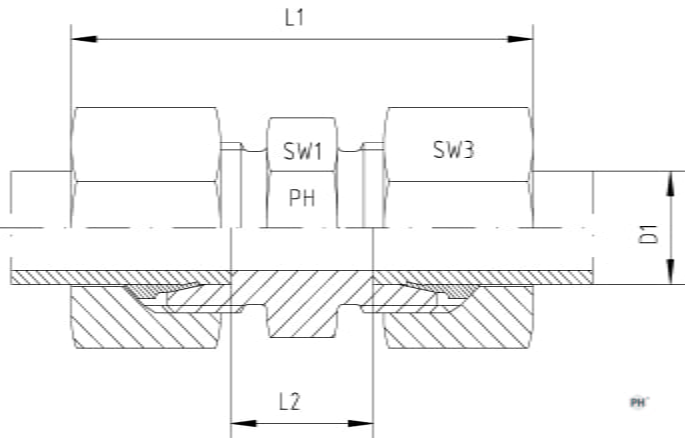 | Vöruheiti | Utanmál rörs D1 mm | Hæð L1 mm | Hæð L2 mm | Lykilmál SW1 | Lykilmál SW3 | Þrýstiþol BAR | Vörunúmer |