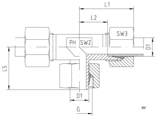 | Vöruheiti | Utanmál rörs D1 mm | Gengjur G M | Hæð L1 mm | Hæð L2 mm | Hæð L5 mm | Lykilmál SW2 | Lykilmál SW3 | Þrýstiþol BAR | Vörunúmer |