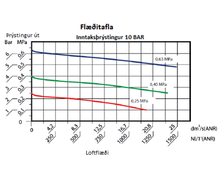 Flæði við 6,3 Bar: 850 Nl/mín